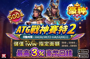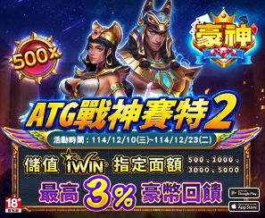《豪神娛樂城》12/10~12/23 儲值iWIN指定面額最高加送3%金幣