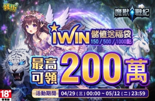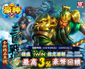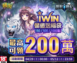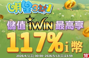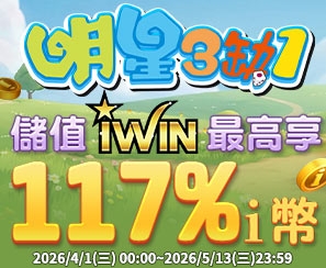 活動期間:115/4/1 ~ 115/5/13 活動內容:於活動期間使用iWIN儲值指定i幣品項,最高享117...