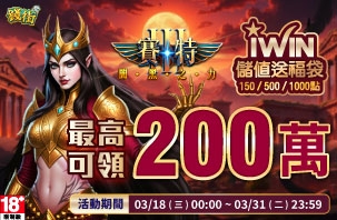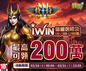 《錢街》3/18~3/31 儲iWIN指定面額150、500、1000可獲得超值福袋,最高可獲200萬c幣!