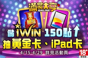 《滿貫大亨》4/15~4/29 儲iWIN 150點以上面額, 抽黃金卡、ipad卡。
