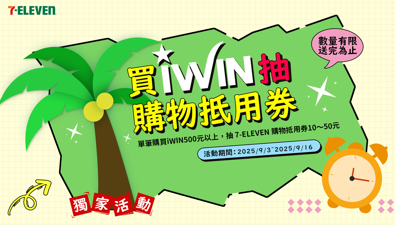 3. 購買iWIN點數卡,單筆面額滿500元(含)以上,抽7-ELEVEN購物抵用券$10~50元(購物金條碼列印於小白單上)。