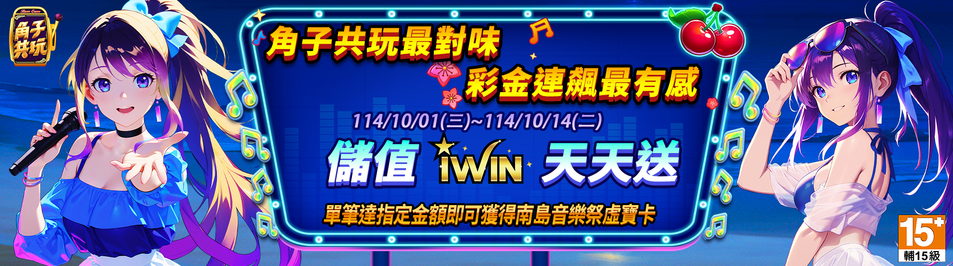 活動期間內,使用【iWIN】之指定面額儲值至【角子共玩】遊戲,