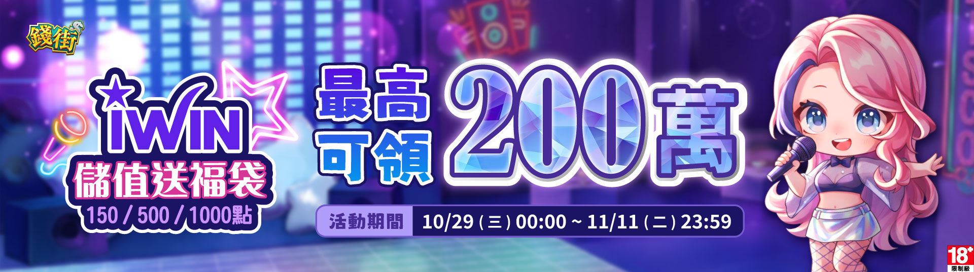 【活動內容】活動期間內,使用iWIN儲值150、500、1000元至《錢街》遊戲內即可獲得超值福袋乙只,最高可獲200萬c幣唷!