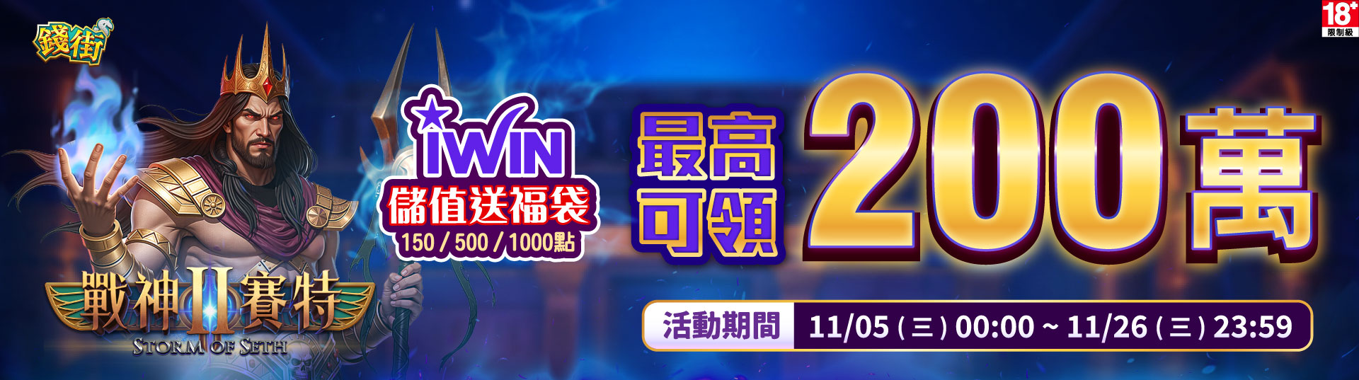 《錢街》11/5~11/26 儲iWIN指定面額150、500、1000可獲得超值福袋,最高可獲200萬c幣!