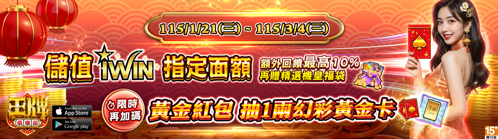 活動說明:活動期間內,使用【iWIN點數卡】儲值指定面額,享額外回饋最高10%,加贈【精選機皇福袋】,期間限定再加碼【黃金紅包】,讓您馬到成功、金馬大獎瘋狂中!