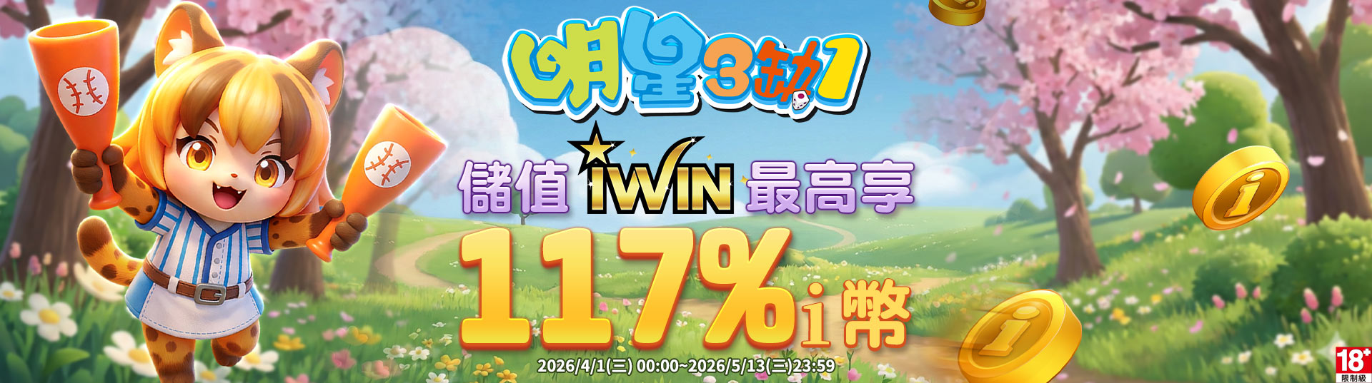 活動內容:於活動期間使用iWIN儲值指定i幣品項,最高享117%i幣回饋!次數無上限!