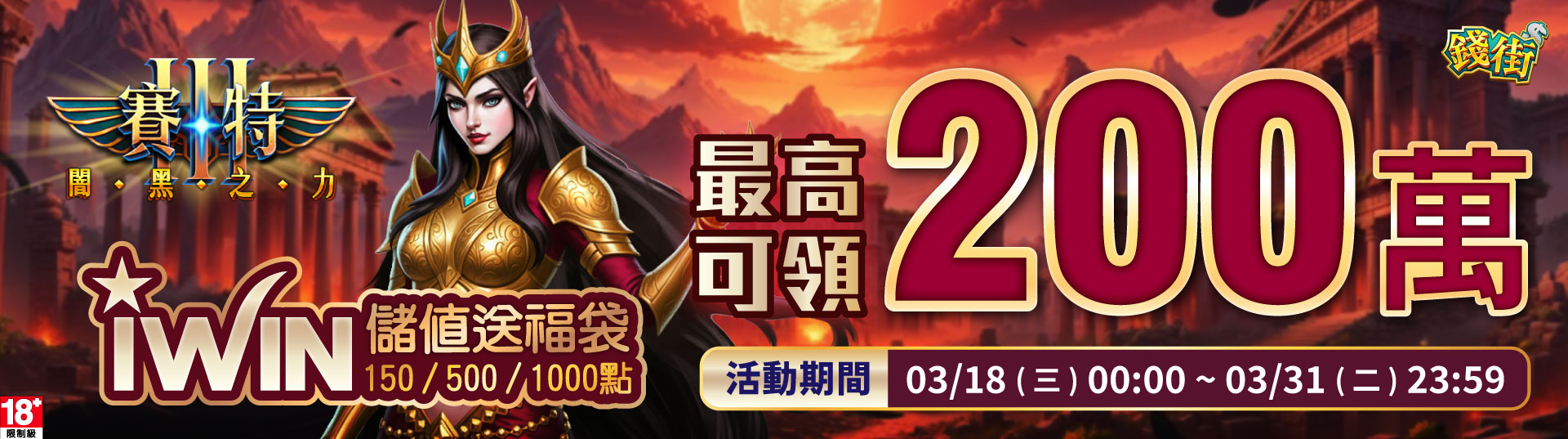【活動內容】活動期間內,使用iWIN儲值150、500、1000元至《錢街》遊戲內即可獲得超值福袋乙只,最高可獲200萬c幣唷!