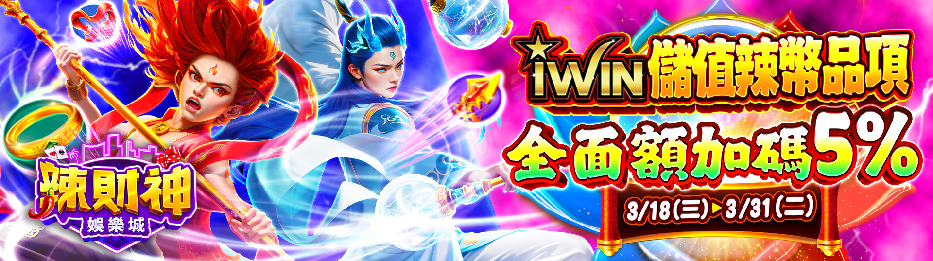 《辣財神》3/18~3/31 使用iWIN儲值,除了原有回饋,活動額外加碼「5%」,最高可獲得「119%」辣幣!