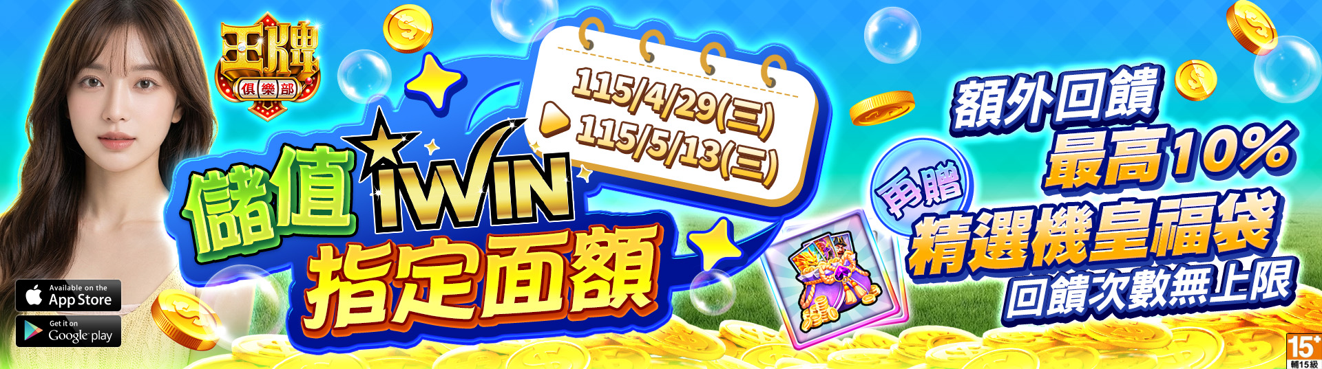 活動期間內,使用【iWIN點數卡】儲值指定面額,享額外回饋最高10%,加贈【精選機皇福袋】,讓您馬到成功、金馬大獎瘋狂中!