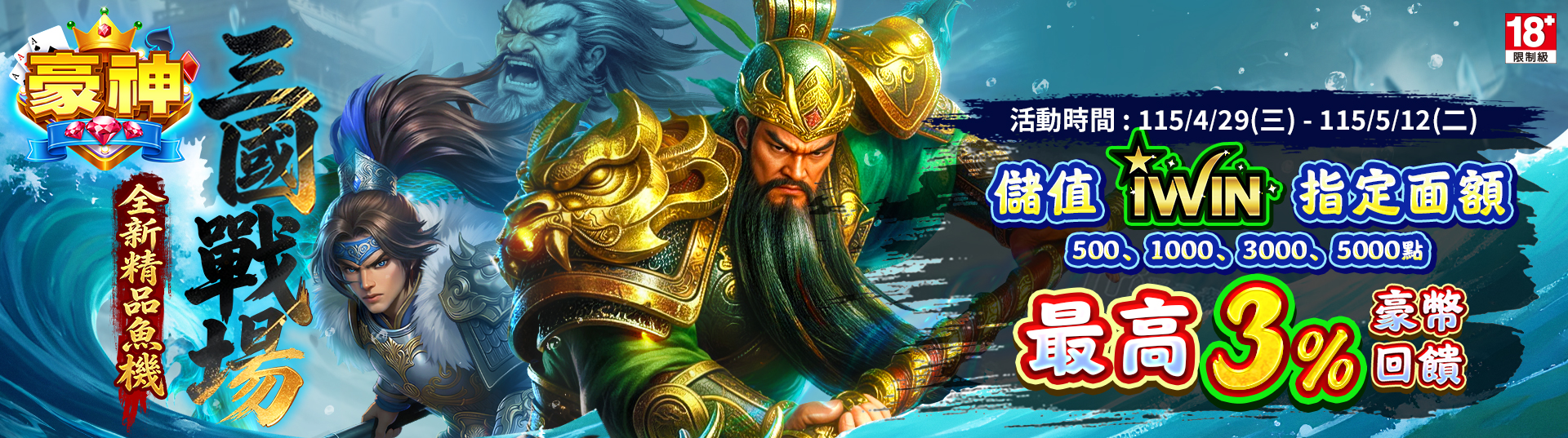 活動期間,透過 iWIN 購買指定面額 500 / 1,000 / 3,000 / 5,000 點,並成功儲值至【豪神娛樂城】遊戲帳號內,最高可享 3% 豪幣回饋!