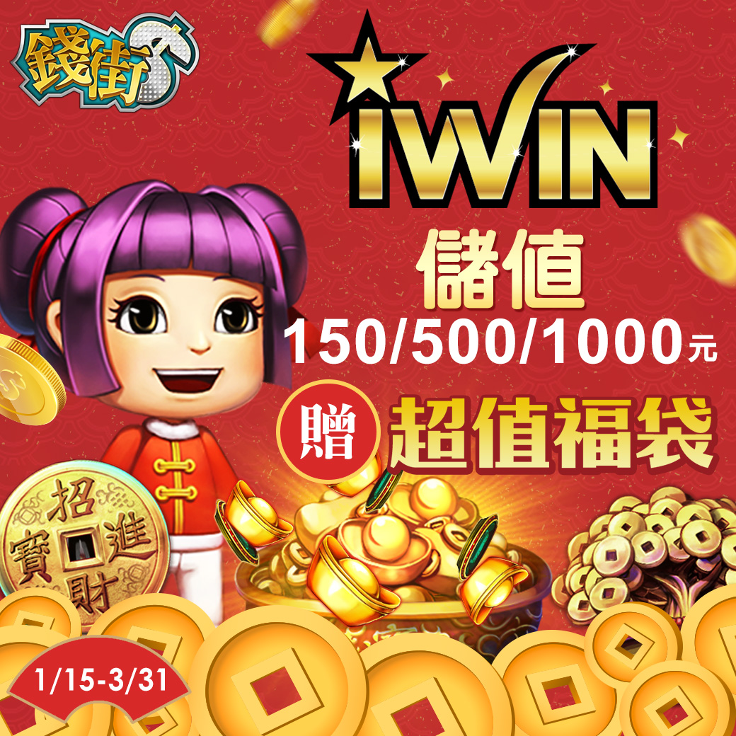 《 錢街 Online 》自 2020 / 01 / 15( 三 )AM 00 : 00 起 ~ 2020 / 03 / 31( 三 )PM 23 : 59 止,凡使用官方進行「iWIN」卡儲值指定面額150、500、1,000 元,並成功儲值到「 錢街 Online 」之遊戲帳號,即可獲得超值福袋乙個。